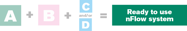 We hebben bestellen eenvoudig gemaakt. Om een compleet systeem te maken, kunt u uw gewenste nFlow™ systeem (A) en mutsje (B) kiezen en vervolgens een nasale prong (C) en/of -masker (D). U kunt op elk gewenst moment afzonderlijke items bestellen op basis van uw behoeften, wat ook onnodige verspilling voorkomt. Gebruik de maattabel om de juiste optie voor uw patiënt te kiezen.